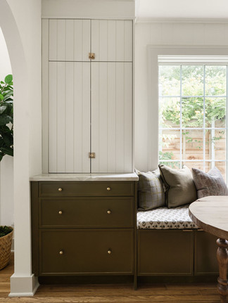 The kitchen and dining space is a blend of practical storage and layered charm. We used olive skinny shaker cabinetry for the lowers and cream beaded panels for the uppers, creating a palette that feels grounded yet airy.
